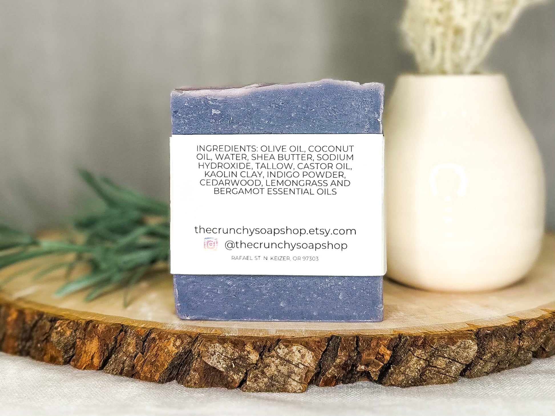 Olive oil, coconut oil, water, shea butter, sodium hydroxide, tallow, castor oil, kaolin clay, indigo powder, cedarwood essential oil, lemongrass essential oil, bergamot essential oils