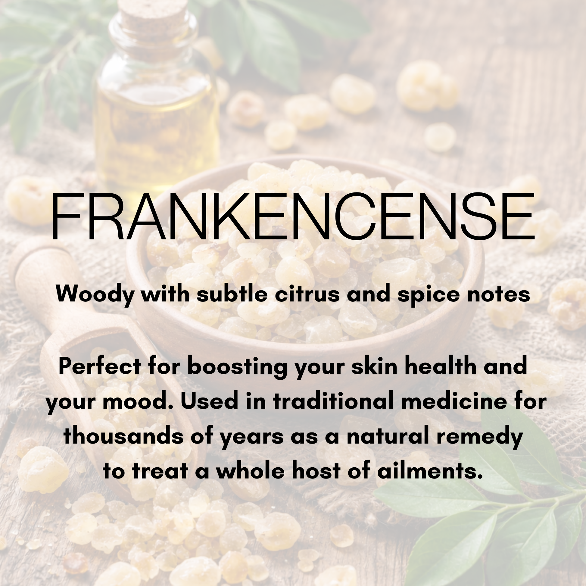 Frankincense - used in traditional medicine for thousands of years for its impressive therapeutic properties, it’s a woody scent with hints of citrus and spices