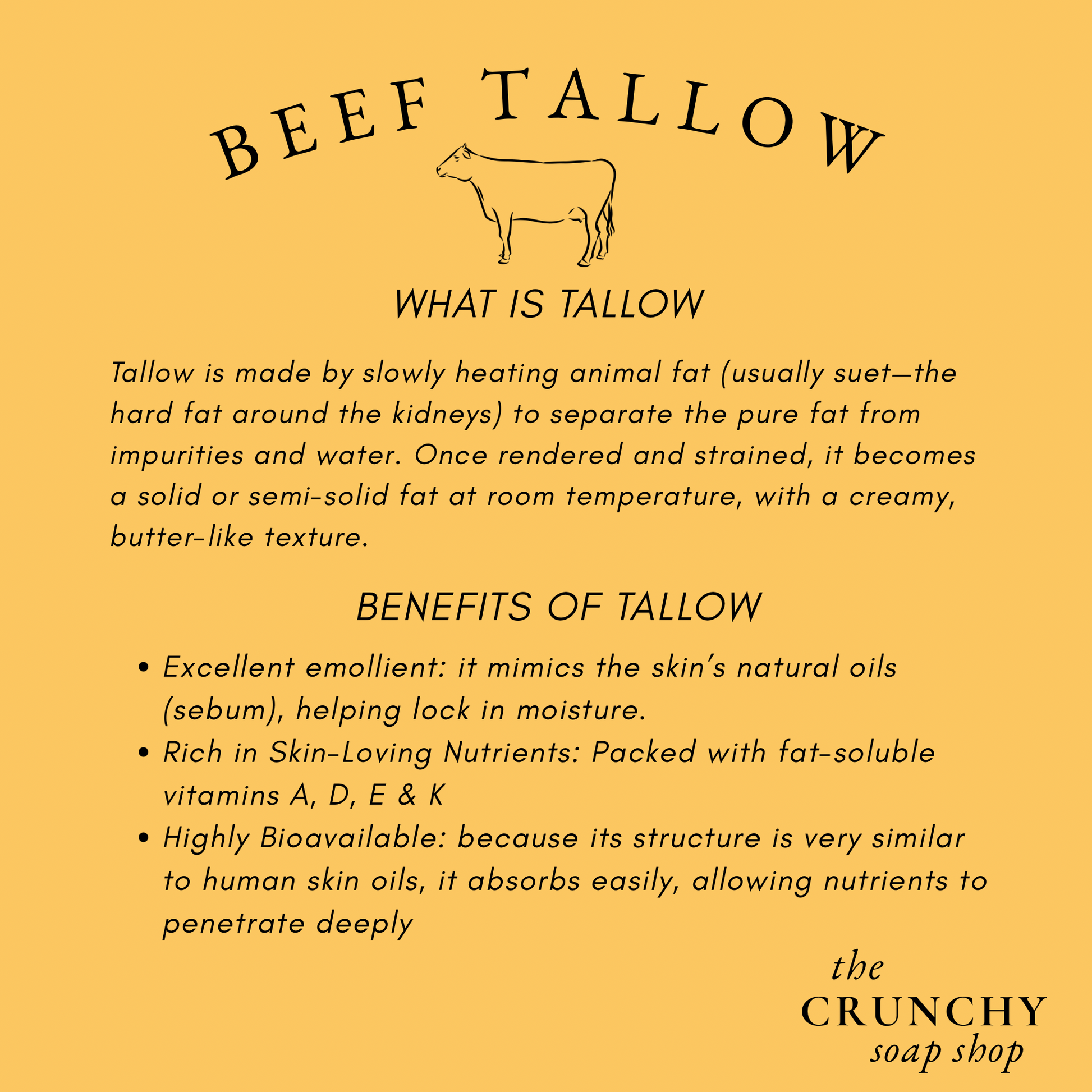 Tallow has a very similar chemical make up to our natural skin allowing it to absorb easily and deeply penetrate. It’s packed full of fat solution vitamins and shares similar fatty acids with our sebum (skin’s natural oils) making it the perfect choice for dry, chapped, irritated or sensitive skin. We get suet tallow from a local butcher and dry render each batch, ensuring it’s clean, top quality tallow.